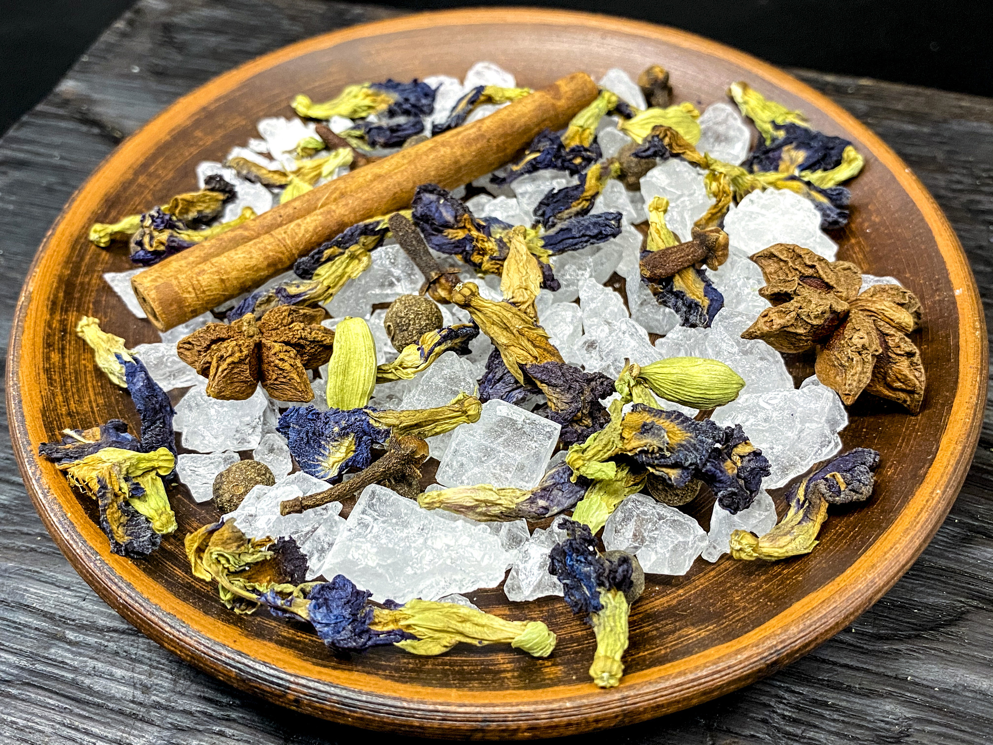 Имбирь, корица, кардамон, гвоздика, гречишный чай, клитория тройчатая, душистый перец, леденцовый сахар.
